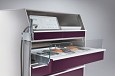 Een hooglans, eenvoudig te reinigen front van Polygloss SR in verschillende kleuren verkrijgbaar. Een zeer hoogwaardige, uitklapbaar, extreem duurzaam, voegenvrij en hygiënisch Corian werkblad gemaakt van acrylgebonden mineraalwerkstoffen.
