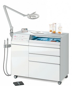 Deze pedicure-unit is gemaakt van hoogwaardige materialen. Het front van de unit is verkrijgbaar in "Icy White" of "Helgrijs", de zijkanten zijn lichtgrijs uitgevoerd. Het bovenblad van de unit is rondom voorzien van een rand uit polyurethaan. De geïntegreerde UV-lade is volledig uitschuifbaar en zorgt voor een "kiem-arme"opslag van het instrumentarium. Het meubel is uitgerust met vier ruime berglades, die elk zijn uitgerust met een geremd systeem voor een geruisloze sluiting. Aan de linker- of rechterzijde bevindt zich nog een opbergkast. De unit beschikt 2 motorische handstukken: Een sprayhandstuk van de NT Micro met intern LED-licht. De spray-functie is voorzien van interval-spray voor een fijne verneveling en een overzichterlijk werkgebied. Het handstuk is in te stellen van 2.200 tot 42.000 toeren omwentelingen per minuut.Een afzuighandstuk van de AT Micro. De stofafzuiging wordt voorzien door een Miele stofzuiger en is in te stellen van 140 tot 220 Liter per minuut. Het handstuk is in te stellen van 5.000 tot 42.000 omwentelingen per minuut.
