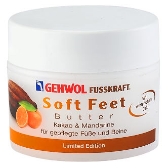 GEHWOL FUSSKRAFT Soft Feet Butter verwent gestreste voeten en benen met weldadige cacao en hoogwaardig mandarijnschil-extract.