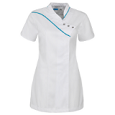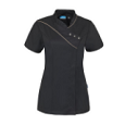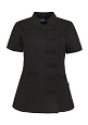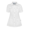 Getailleerd kort damesjack met ¾-mouwen, dubbele ronde borstzak met klep, epauletten, schuine deelnaden, telefoonzakje, sierstiksels, zijsplitten en mét voorzakken.