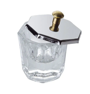 Transparante glazen container met deksel voor het kort bewaren van acrylliquid of acrylpoeder.